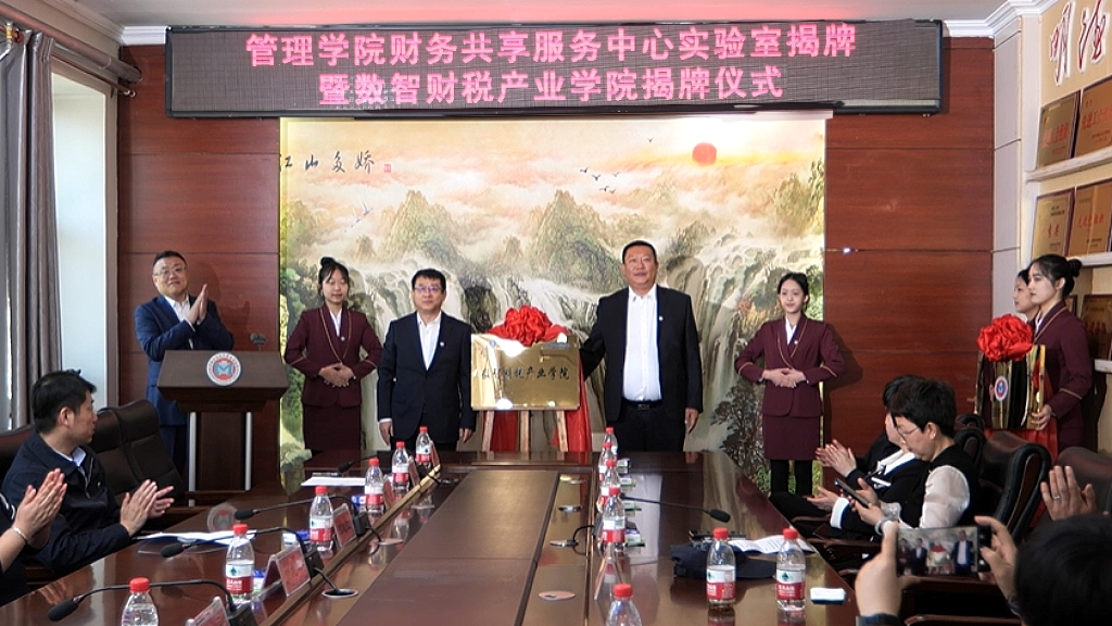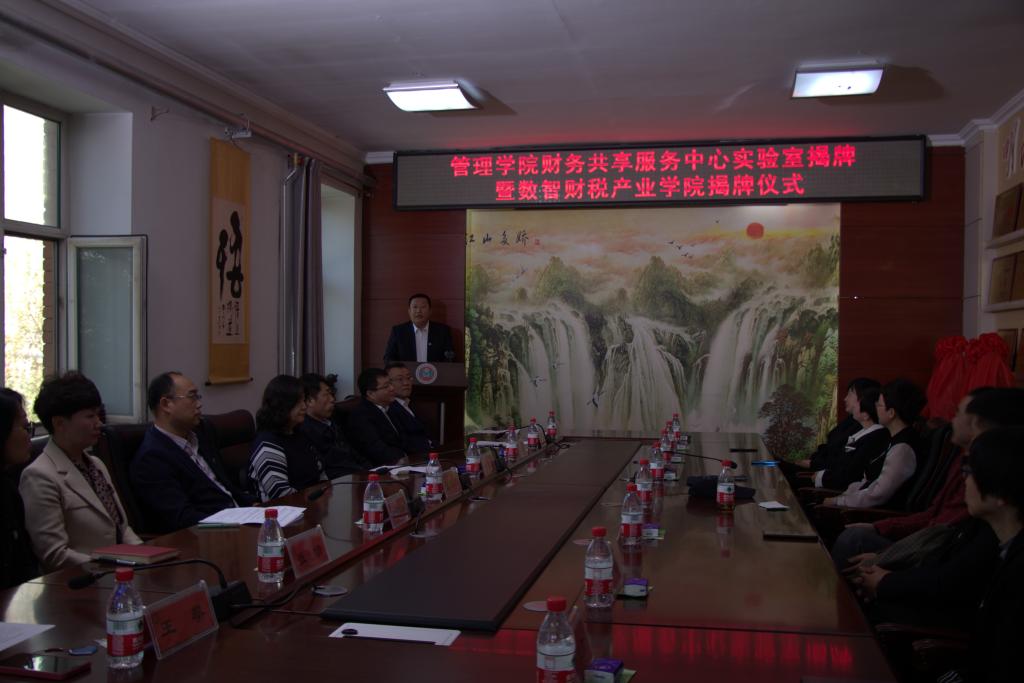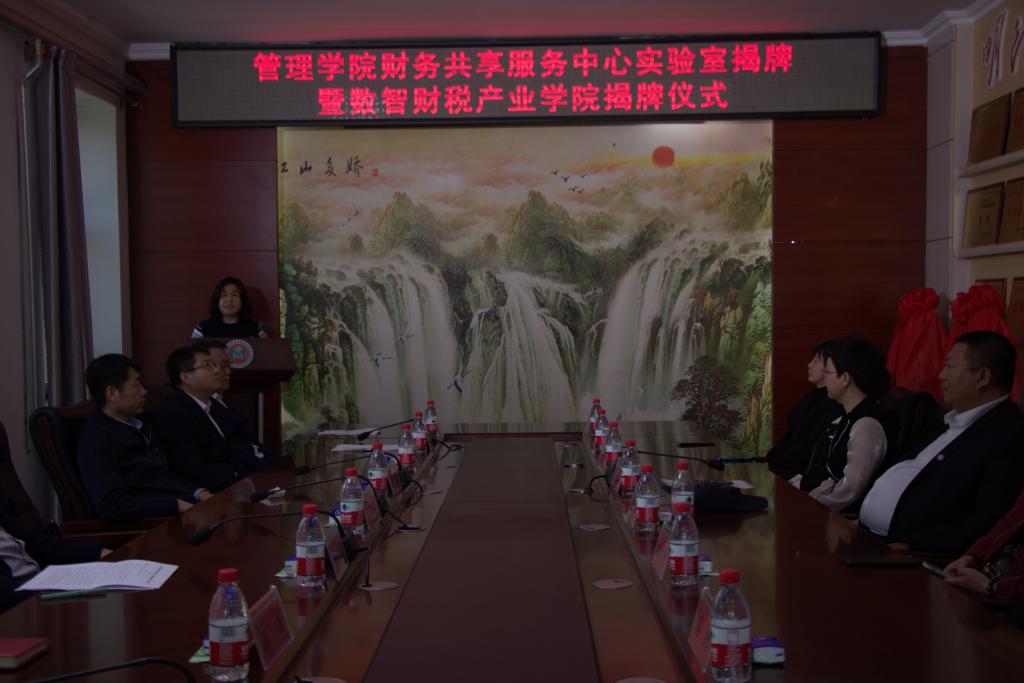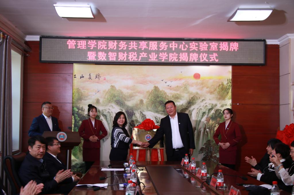 谭旭红副校长、管理学院副院长洪亮分别和黑龙江航天信息有限公司总经理任海鹏为“财务共享服务中心实验室”和“数智财税产业学院”揭牌。